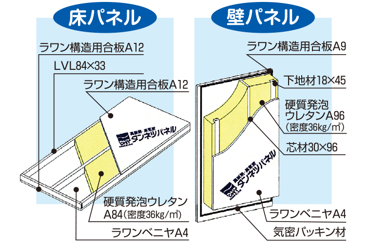 同社が採用する「木造在来断熱パネル工法」は、硬質発泡ウレタンをサンドした断熱パネルで、高断熱・高気密住宅を実現、住みよい空間を提供する。躯体強度や耐震性も向上させ、建物が受ける負荷を建物全体でカバーする仕組みで、耐久性に優れた工法だ。
