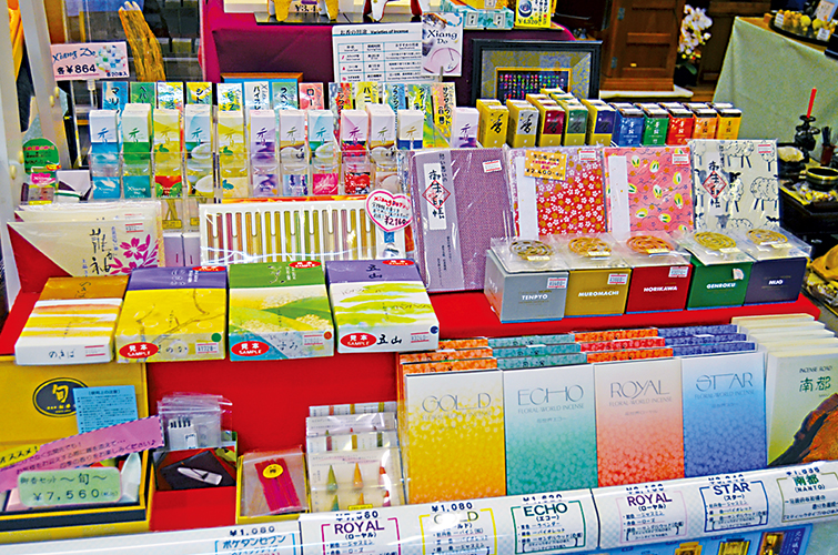 国産の良質な仏壇をはじめ多様な仏具を提供。中でも創業宝永2年、京都の老舗「松榮堂」の線香は花などの香りとは異なり、白檀、沈香を原料として作られた高級感のある香りで人気。進物用も販売している。