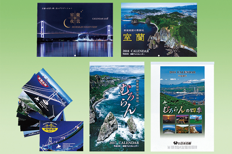室蘭の名所や夜景の写真をデザインに取り入れたポストカードとカレンダーがお薦め。自社で撮影したほか、室蘭のアマチュアカメラマンが絶景の数々を捉えた。